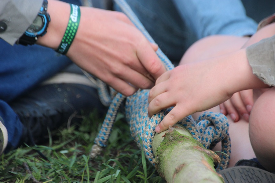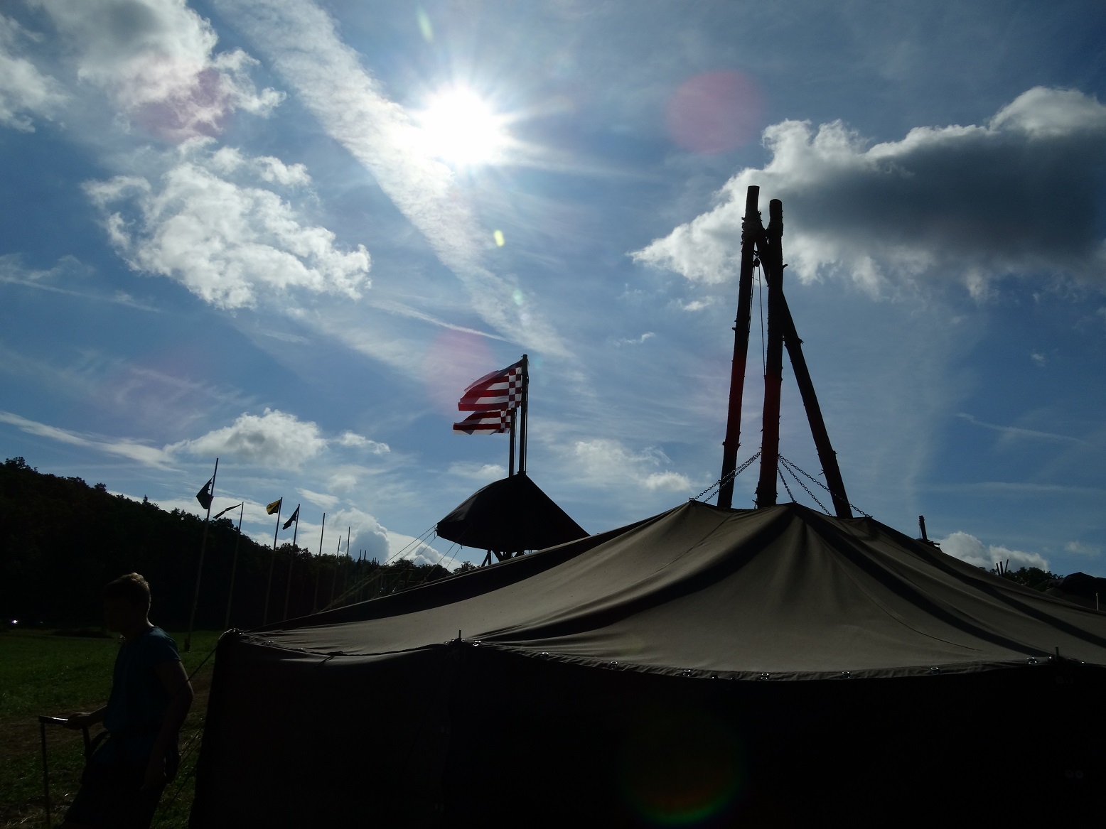 Schnell haben wir unsere Rucksäcke und Materialien aus dem Bus genommen und sind Richtung Lagerplatz gelaufen. Nachdem uns unser Standplatz zugewiesen wurde, fingen wir an unsere Zeltkonstruktion zu errichten, diese wurde von unserem Materialwart Lasse erstellt.